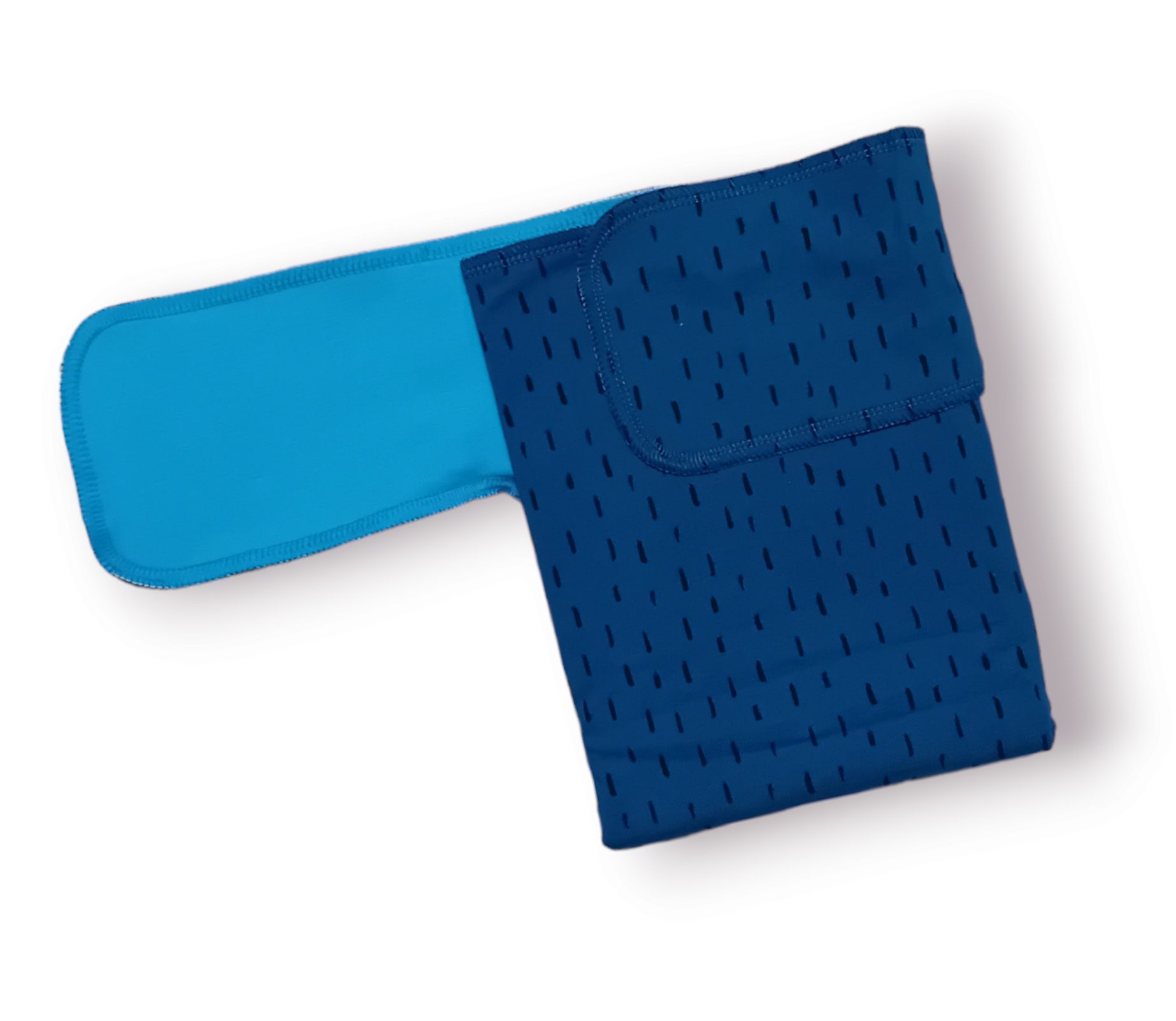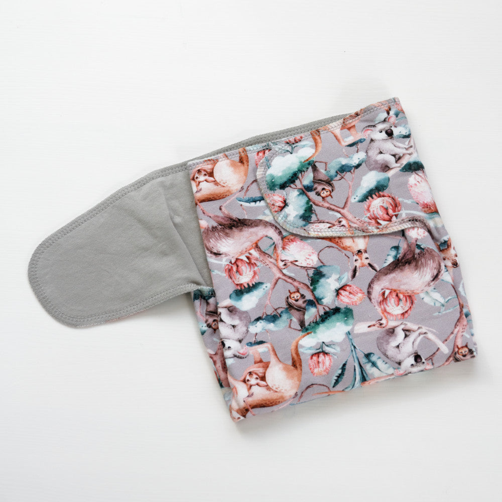 A fralda na sua forma desdobrada é constituída por 3 camadas: uma camada externa de malha de algodão jersey orgânico com padrão e uma dupla camada interna de tencel*, mais fina no centro e mais grossa no interior (dobrada em 3 dá um total de 9 camadas). Ambos os tecidos são revestidos por elastano ou que conferem elasticidade à fralda, facilitando muito o seu ajuste.