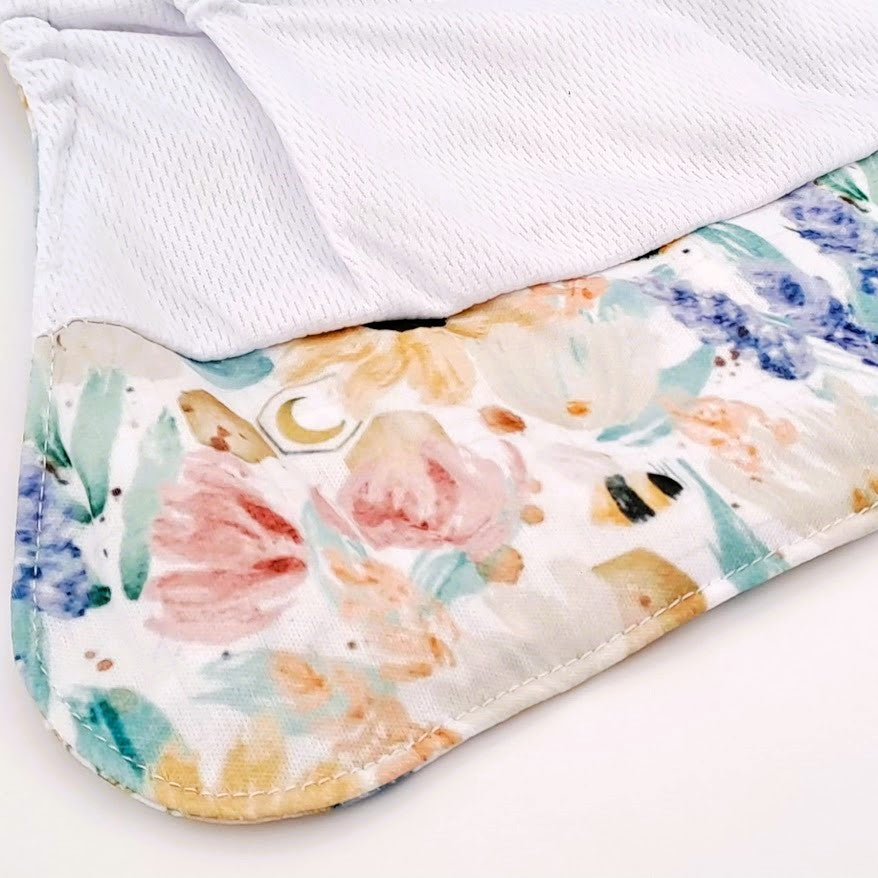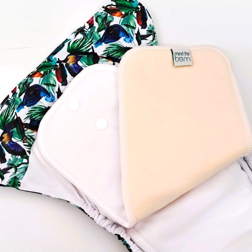 A nossa fralda "Tudo em 1" ou "all in One" (AIO) possui um núcleo absorvente composto por duas camadas de bambu algodão e duas de cânhamo e algodão,
