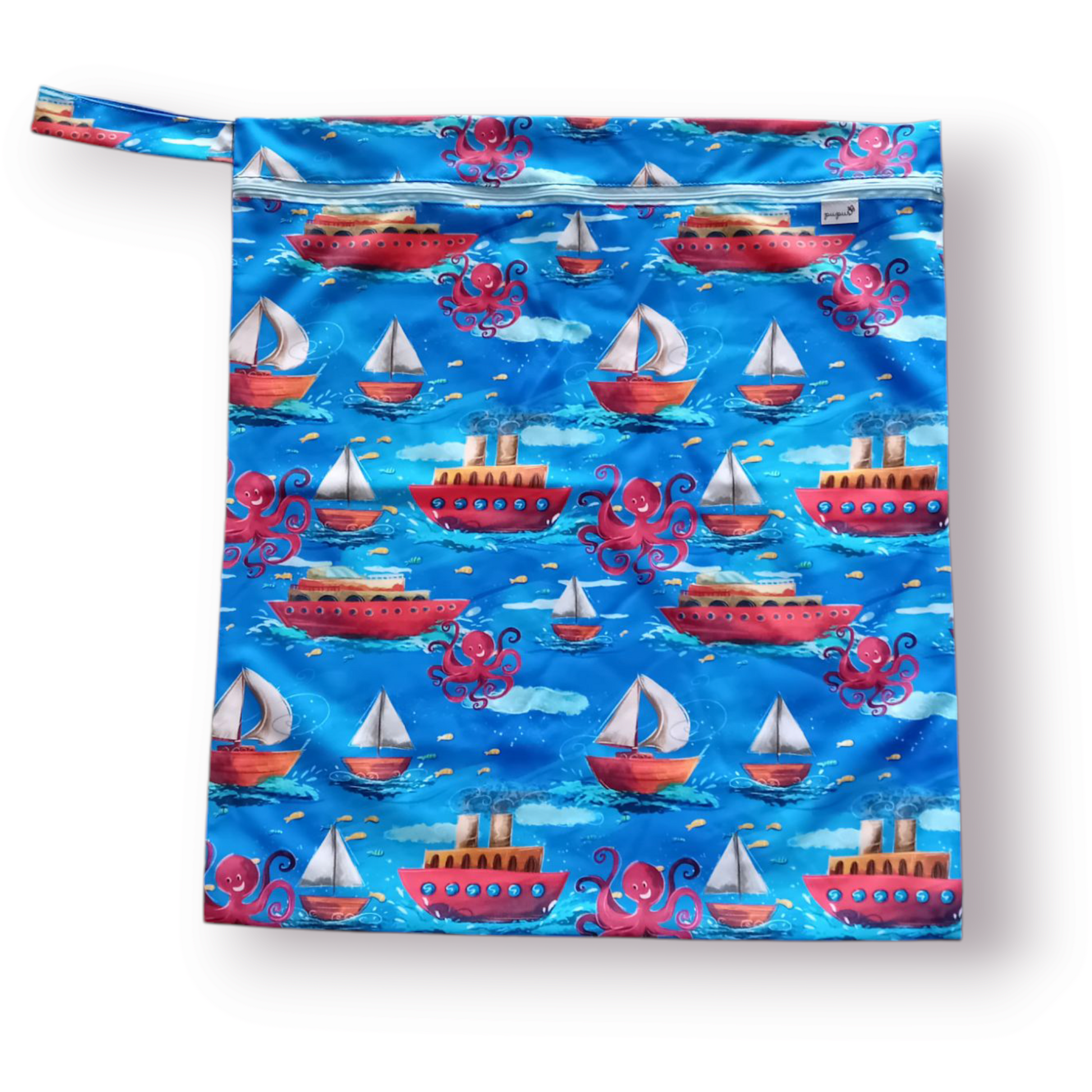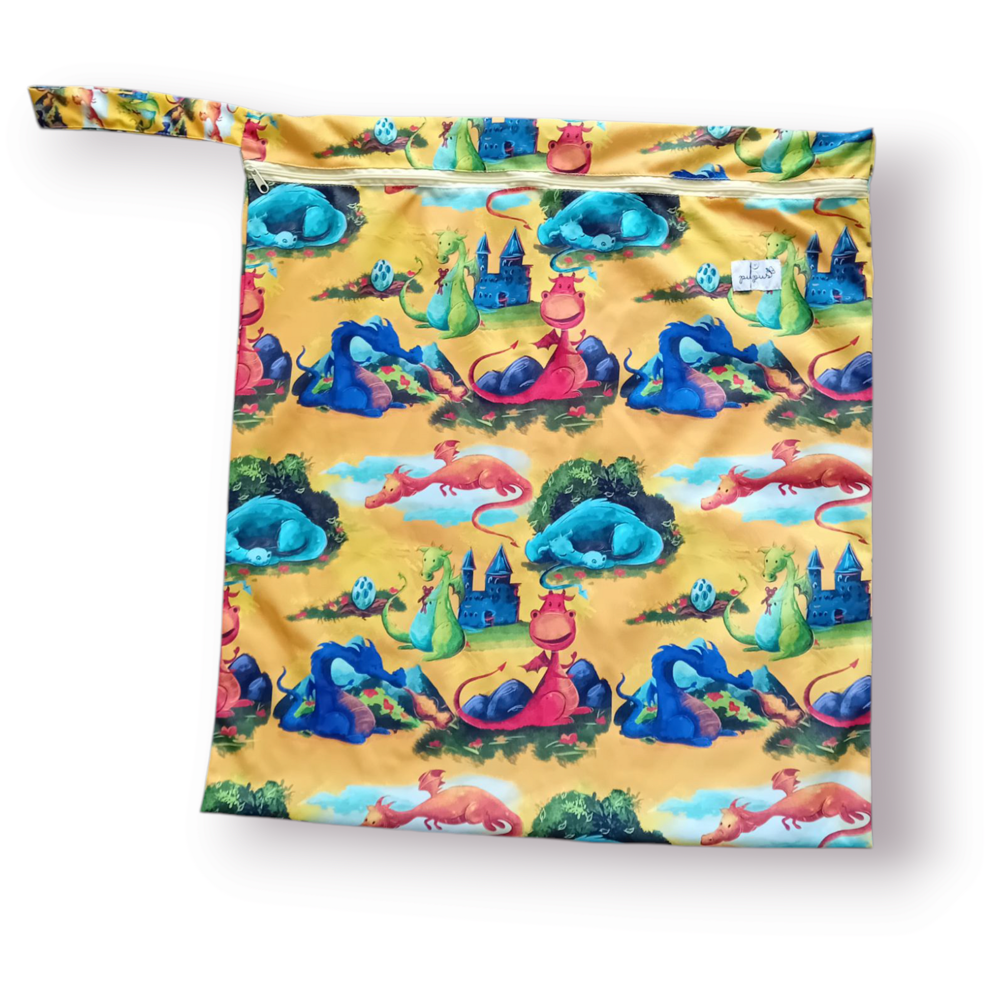 O saco possui um generosos tamanho, capaz de transportar ou guardar até 10 fraldas reutilizáveis com absorventes, respectivamente. É totalmente à prova de água e cheiro. Fecha com zip.